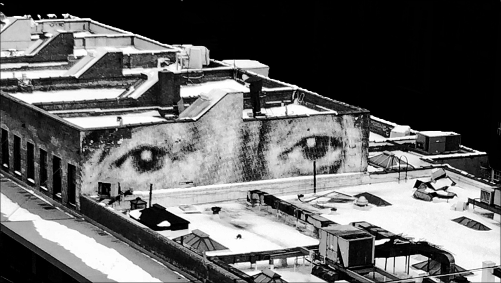 Interesting eyes on the building... Great photo find !! I suggest darkening the building that are already dark - top right corner. Good eye to find this mural. Great image.