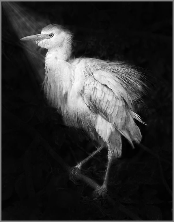 Very good image... Nature competition is quite often a lot about habitat as well as the bird so that is probably why it scored well with no change to the background. Our club is heavy into nature and they consider the surrounding of an image as important as the main subject. Just like with PJ - an image telling a story is important. Anyway, If you stay with the mono, your background needs to be darker and also you need a reason for the bird being lighter so create a sunray which could naturally occur. I created one to show you what I mean - you can use curves to lighten the bird after adding the ray and also to darken your background - just find the spots on the curves and change it. I do agree that in pictorial, the background would be too distracting. Back to your computer and photoshop !!