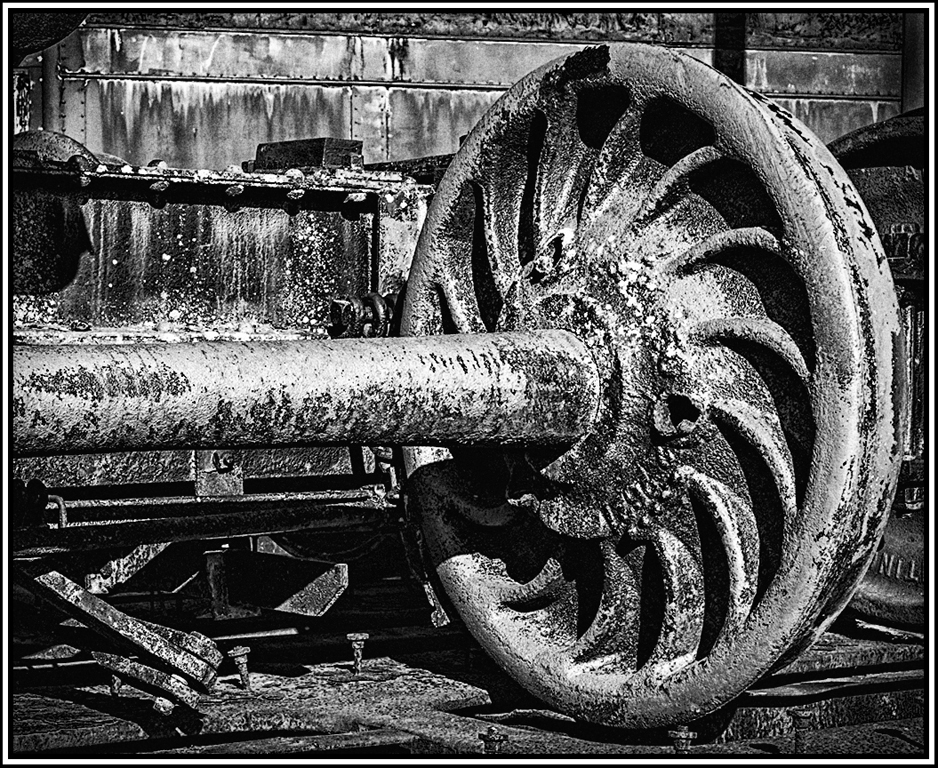 I think the mono is better than the color. If you use the color, change the hue slightly in the image. I do suggest using Topaz - detail to bring out the edge of your old machinery more and then use the NIK wet rocks again with a dark vignette edge. This will increase the contrast and provide dark blacks and the grunge on the machinery be more impactful. Can't believe we missed this in our flickr search.