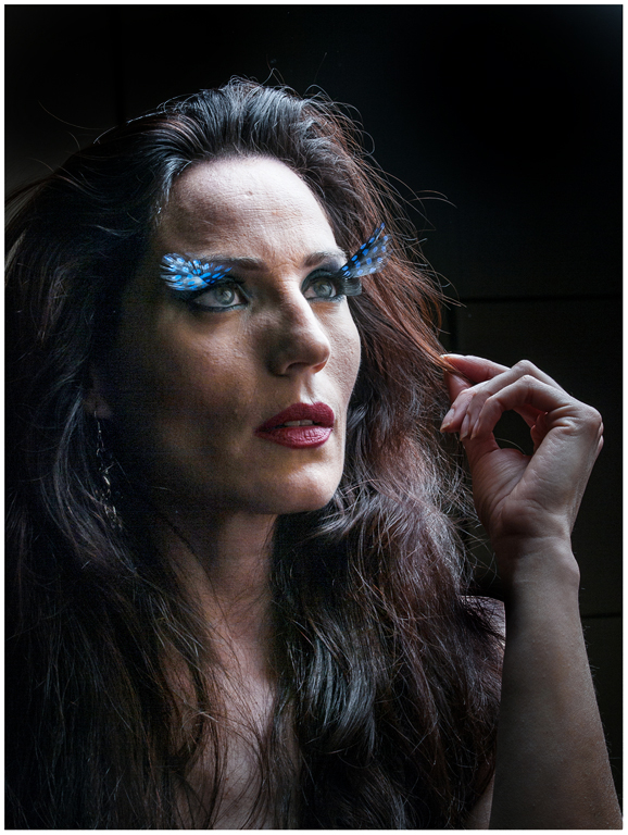 Interesting eyelash or eyebrow attachments... The lighting is too harsh for me - suggest dodging parts of the face and hair to improve the portrait. Also her left shoulder is too bright - burn it loads. Also, burn the hand so your attention is on the face area. Interesting portrait. |