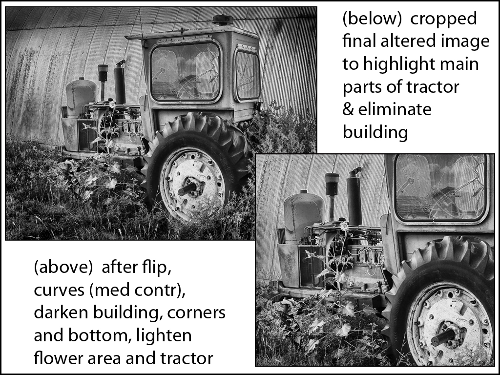 Very interesting subject... With tractors, I have found that making the tall cab be on the right helps hold you in the image. So, I suggest flipping it, darkening the building, foreground and corners and lightening the tractor and flower area. After my corrections, with subjects like this, cropping in can provide a more subject enhanced image. When I find subjects like this I take wide angle and lots of cropped-in closeups of the interesting areas of the abandoned machinery. Just to give you some ideas. Great eye to see the image. Color faded image of these subjects are good competition images too. |