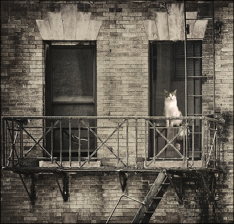 Good image of old building... Would like to see your original. Good use of Viveza and the sepia tone. This is a good image with lines holding you in the image. To create a good center of interest, find a big flower pot or cat or other subject to put in a good place in the image (close to 1/3 spot in the image). Use a mask to add back the metal part of the balcony to make the cat appear to be in the balcony behind the railing. For competition, the cat or new subject needs to be taken by you. This addition would improve the image and provide an interesting center of attention. Good job. |