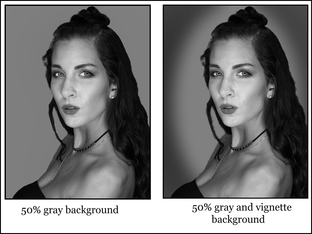 Good job on your portrait... With dark haired model you either need a light background or better hair lights. I agree the background provided was gross !! If you want the hair to stand out select the model and change the background. I provided two examples - I prefer the vignette light background but whatever the photographer wanted. I used 50% gray for the basic background. I would lighten the model - she is a little too dark for me. Good job. |