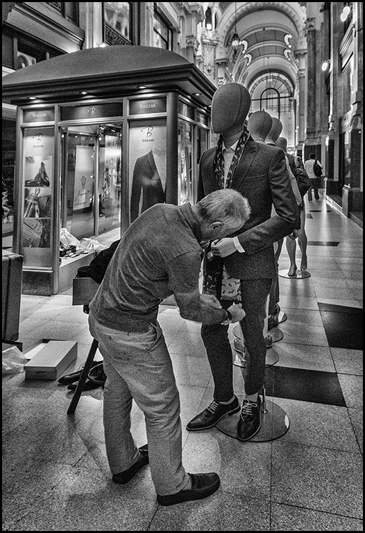 Great job... I really like your image. The worker and the mannequins are nice arranged in the image. I would crop far left mannequin out of the pic. The sharp contrast " wet rocks " really works for this image. Great job. |