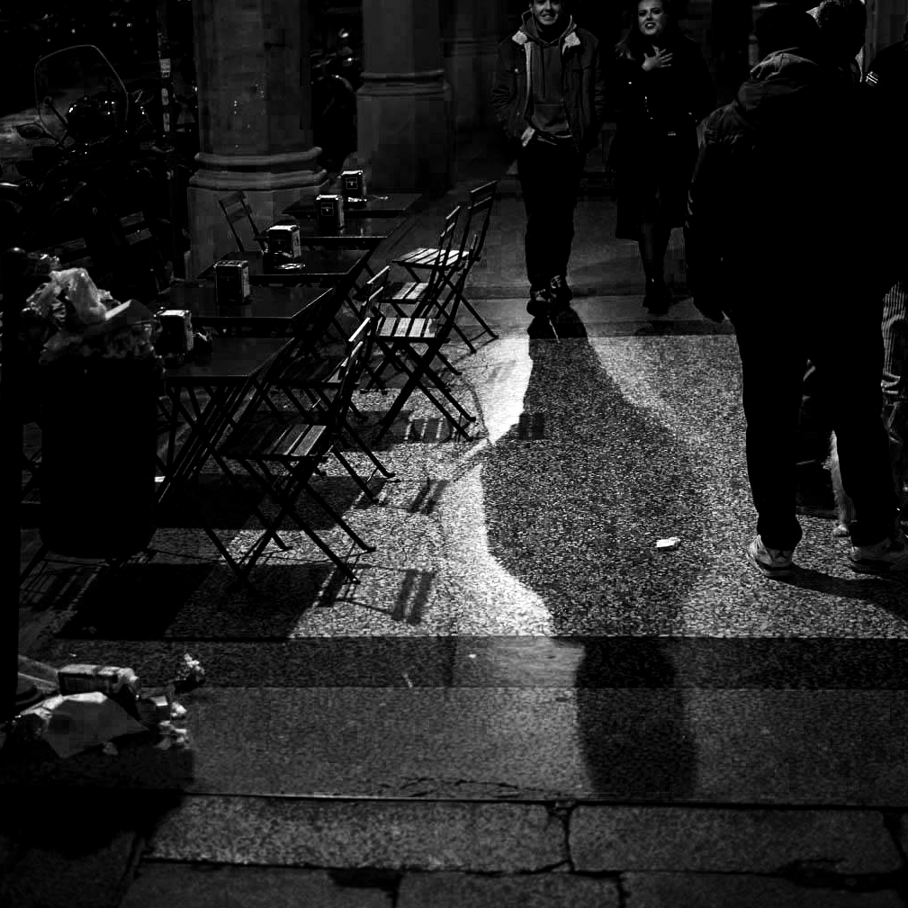 The original image reminds me of one's youth - when you went out with friends and had so much fun that you lingered even after the bars closed. You see that in the image - the chairs are empty, the trash is out and a few happy people are still milling about. I cropped the original to show the smiling faces, the trash etc I emphasised also the long shadow as it adds an important element to the atmosphere.