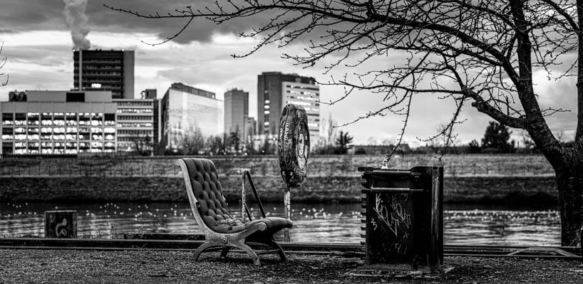 Adrian - I admire the objective you set out to show the contrast between the organized industrial background and the random arrangement of objects in the foreground. I found that the chair and the tree on the right lead the attention away - I attempted a tighter crop recognizing that it removes the cinematic aspect. |