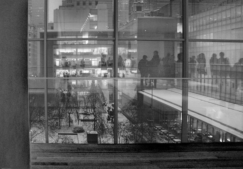 Mark - great interpretation of what you saw in an instant. The original color image shows 3 aspects : the outside street scene and buildings, reflections of what is behind you and the frame of (a window?) that you are looking through. The reflections are clearly evident in the original and more difficult to retain in the B&W conversion.