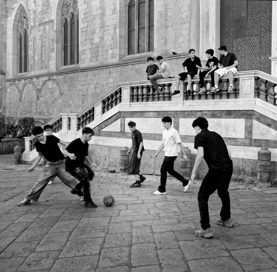 Adrian - Mark - thank you for your suggestions . I also implemented some suggestions for a tighter crop which does provide more focus on the players. One of the things that I noticed at the time was that the game was being played in the street in front of the church ( due to the lack of green spaces in Naples and to the fact that soccer fans play soccer whenever and wherever they can ) and I wanted to retain that context.