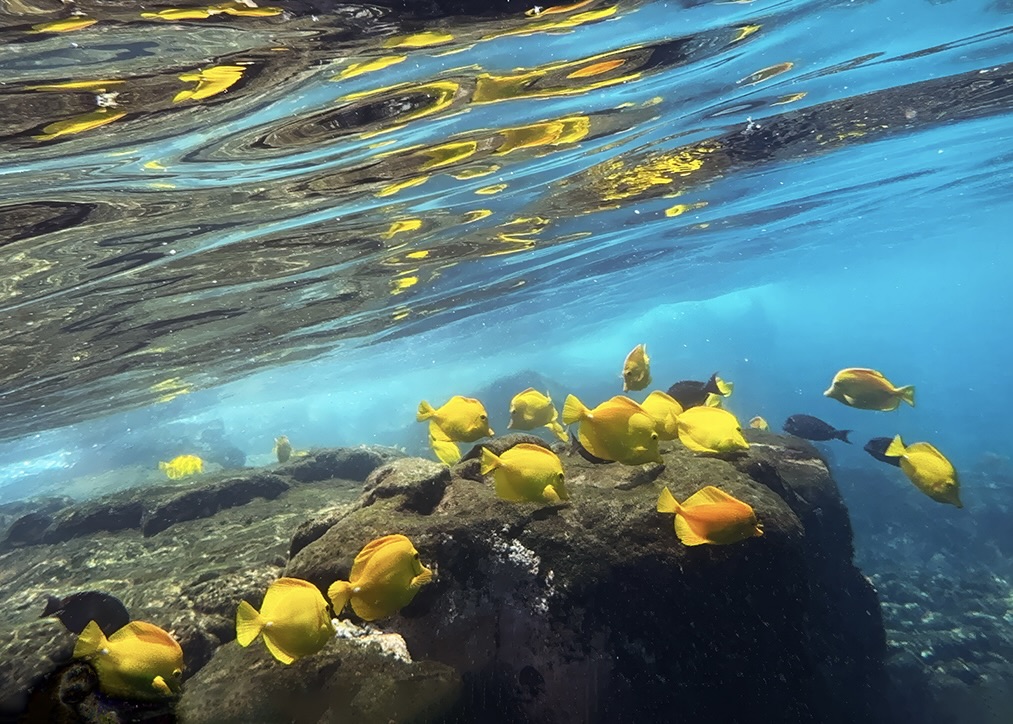 I do like the swirling yellow at the surface as well as the Tangs. I had the pleasure of snorkeling on Maui last year and loved all the colors of the fish. I often prefer a tighter crop. You have probably tried many different adjustments. Perhaps a little less of the darkness below and above... |