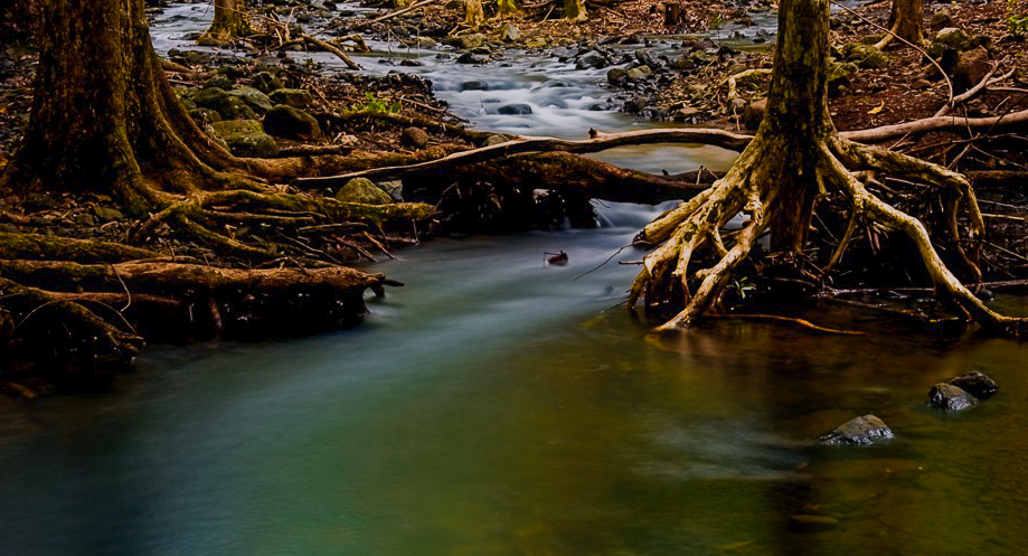 Your sky replacement certainly works. Without your description, I would not necessarily take note of the tree branches crossed over the stream. My eye was more drawn to the upright tree. A lower angle may have worked. Perhaps lightening the stream to draw the viewer's eye up to the branches might help. |