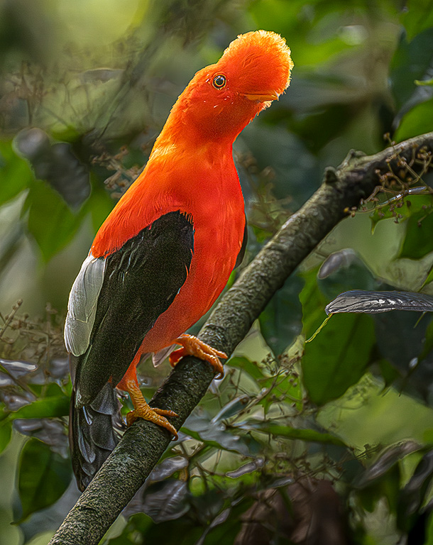 Wow Isaac - you do get around! Thank you for sharing yet another fascinating bird. This is a stunning capture of the Male Cock-of-the-Rock in a highly-contrasting dark green forest. The only suggestions I can offer for your consideration would be to tone down the white reflected highlights on the surrounding leaves, and its leg (I used Lightroom Classic's Regenerative AI Remove tool on the leg), to make this majestic fellow an even greater star of the show. |
