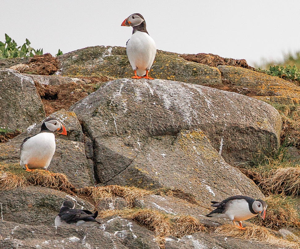 I have suggested several edits for your consideration in the uploaded image. I tightened the crop at top and bottom to focus more attention to all 4 of your Puffins. I lifted the shadows to make the birds stand out more. Then, using Lightroom Classic's Color Mixer function, I lowered saturation on the green and yellow tones so the Puffin's orange breeding colors show true. |
