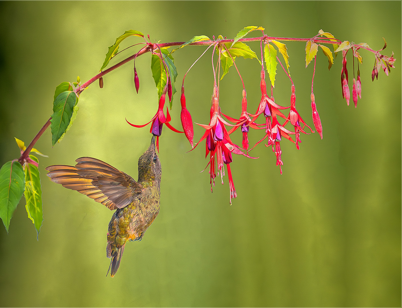 Oh these little guys are tough! You did an excellent job of capturing a thoroughly sharp image - especially at such a slow(for hummingbirds) shutter speed (I usually run 3200-4000). The only possible edit suggestion I have is to consider cropping out that last piece of fushia stem on the left (see attached image), as it can draw the eye away from your main subject. |