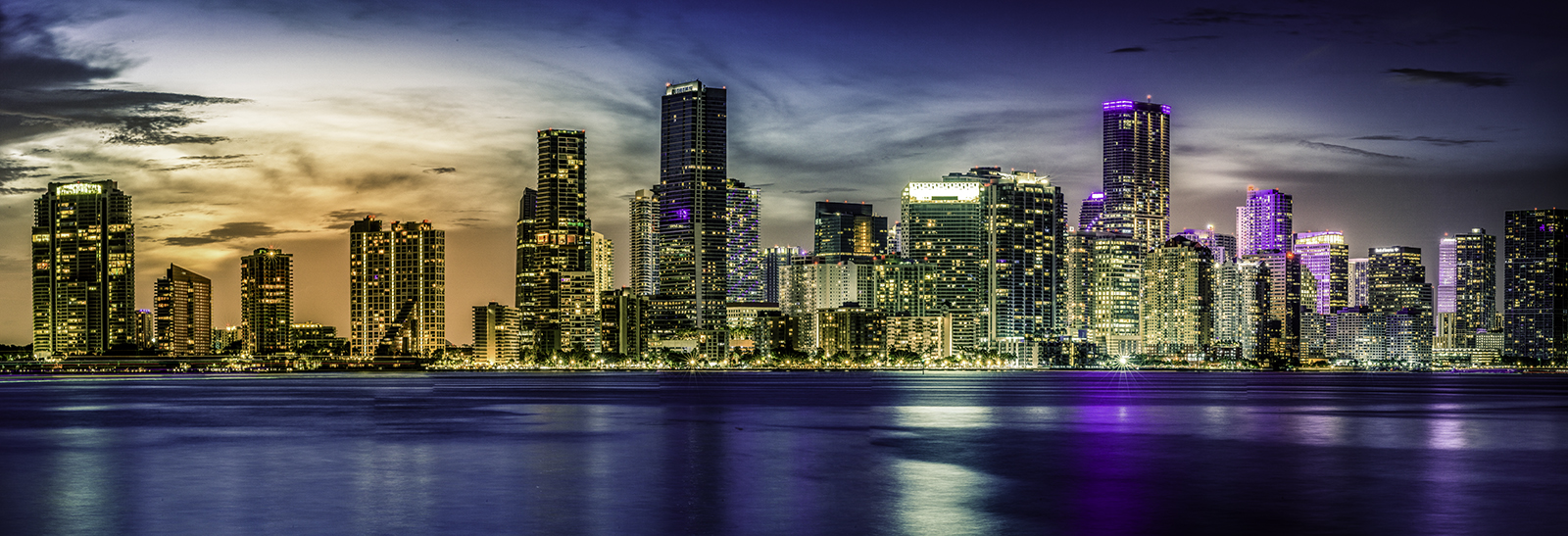 You got you money's worth, Larry! I can see this image included as the $1.95 panorama postcard topping racks at the airport and tourist shops. I'm not familiar with Miami, so I wonder what's causing so much of the purple reflection - especially the very long, bright one below the tall building. Is that a sports team affiliation, something local, or just a result of your long exposure?