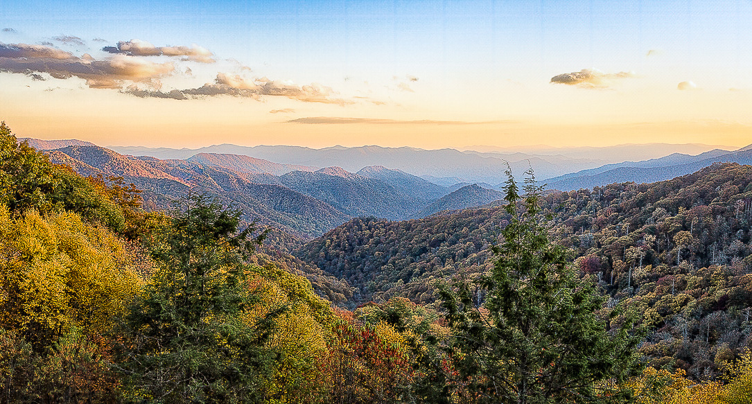 Hi Michael - Good for you - I often find intriguing drama in the light opposite a sunrise or sunset too! This is a lovely landscape. Anyone viewing this image who has experienced the Smoky Mountains at dawn or dusk can instantly feel transported - and transfixed. At your level, there are only minute, nit-picky suggestions for your consideration here - such as neutralizing several lighter distractions (leaves) across your bottom crop. I did a quick LRC "heal" in the attached "Suggested Edits" to keep viewer eyes drawn more deeply into your spectacularly dimensional scene. Additionally, I dragged a quick Linear Gradient down from the top and boosted the blue, which again, I feel keeps eyes focused on the majestic geography and illuminating light. |