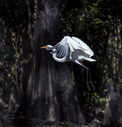 The photo you submitted is a very good photo of a bird flying through forest of cyprus trees . If you crop the photo to remove the vegitation at the bottom and position the bird in the right 1/3 of the photo you focus more on the bird with the forest as a backdrop. This places more emphases on the Egret. Just a thought as your capture is lovely. |