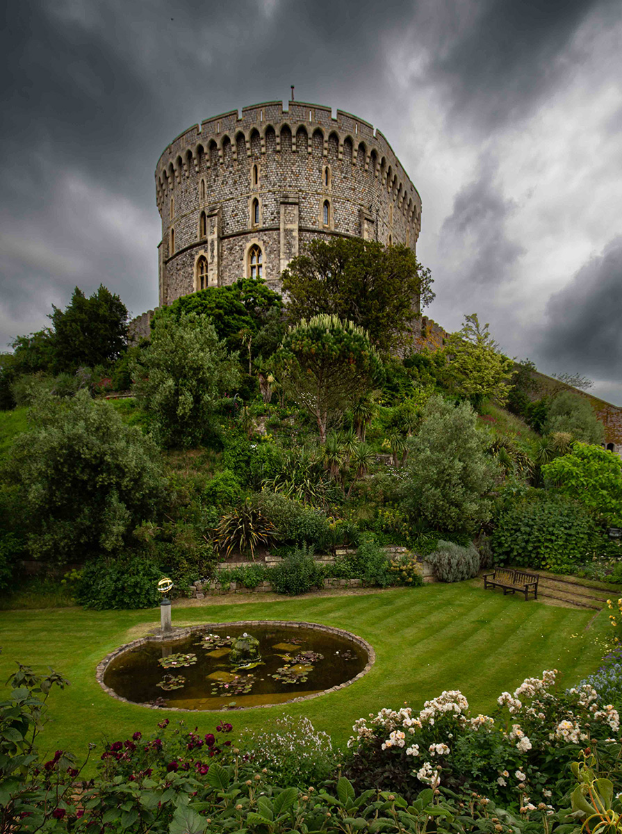 Manas, This image presents a strong sense of history and grandeur. The wide-angle perspective effectively emphasizes the imposing structure of the castle, while the dramatic clouds add mood and atmosphere to the scene. The foreground garden provides rich texture and creates a layered composition that naturally leads the viewer's eye upward toward the castle tower. The circular pond acts as a visual anchor, guiding the viewer into the frame before they explore the architectural details above. The use of a tripod and a smaller aperture has clearly helped maintain excellent sharpness throughout the image.