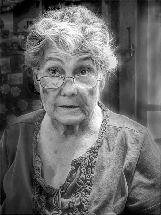 I like the bw, the interesting subject, the side lighting and the expression on her face. It seems a bit flat to me. I think that if you increased the contrast, brought out more details and darkened the background it would be a stronger image. |