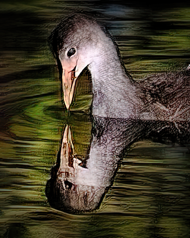 I like what Kurtis has done. I think that the subject is the bird looking at his reflection, like Narcissus. I cropped to reflect what for me is the story. |