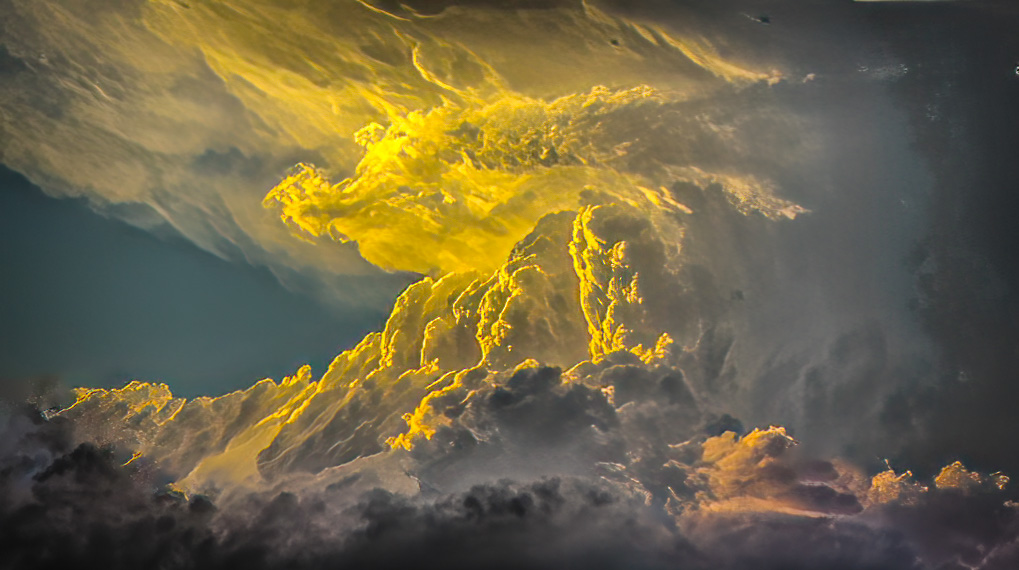 I like the dramatic sky. For me, the sky is the subject. I dfind the blues and trees on the bottom distracting. I cropped and used generative fill to replace them. I tried bringing out more detail and increasing the contrast. It is another approach |