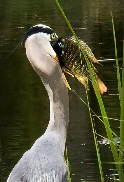 I like the over the shoulder capture and the nice detail. For me it could be cropped to just the head of the bird and the fish. You could also try a vignette and a curves adjustent. |