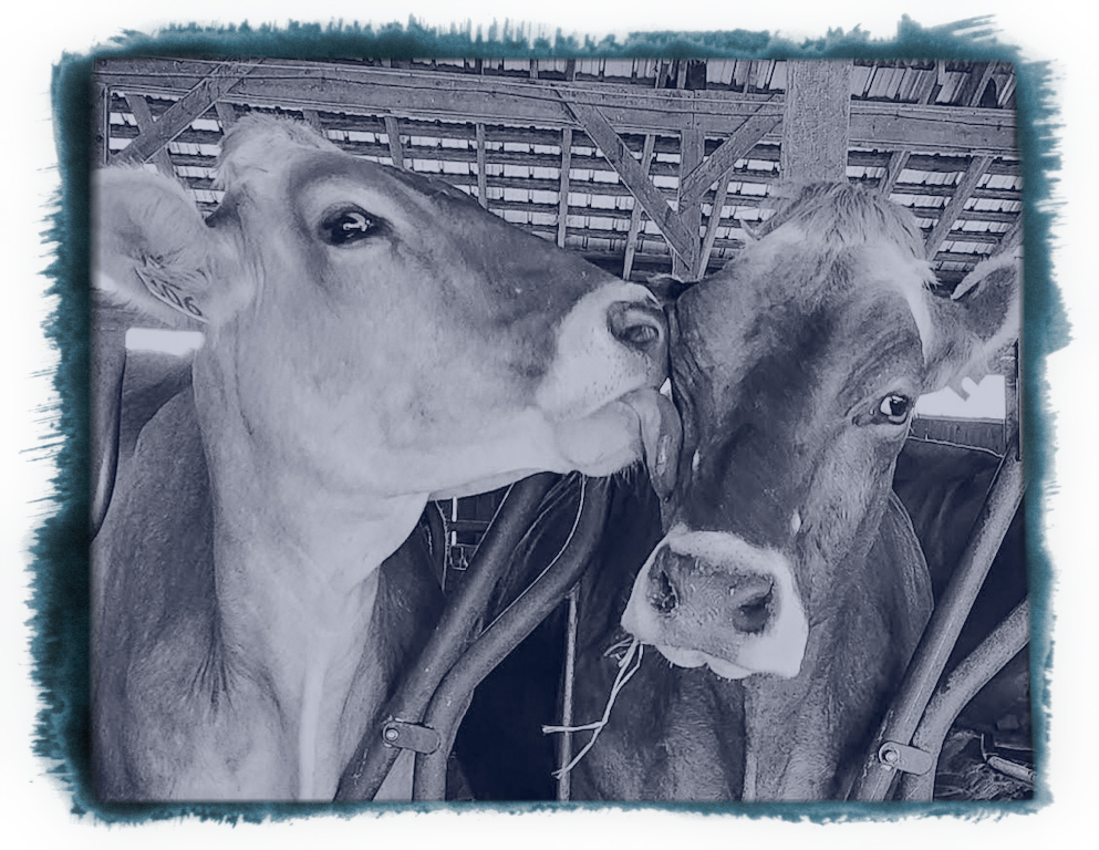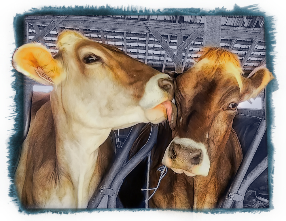 Laurie, here is another option that retains selective color. I used masking to allow the color on the cows, but left the distracting background in black and white. I also applied an oil painting filter to get rid of the noise and decreased the yellow color cast on the cows with "replace color" in PS. I let the cows' ears pop outside of the edging to bring more attention to them. Thanks for letting me have fun with your photo! |