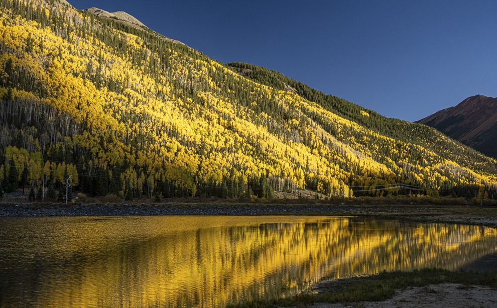 The color and reflection of the Aspens is amazing. My only suggestion is the image seems to tilt with the lake shore. I adjusted the tilt but when I did this the aspect ratio changed a little. |