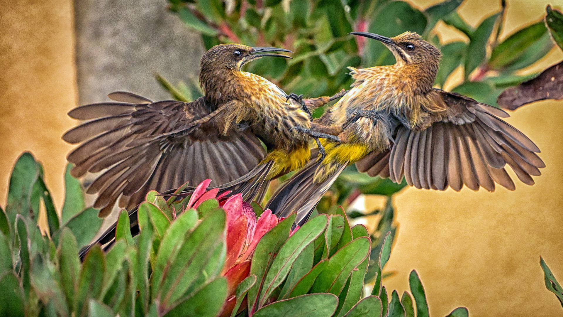 Thanks Isaac. The Cape Sugar bird nests in the vegetation of the protea plants. Being nectar feeders these were fighting for the particular flower or rather the nectar in it. |