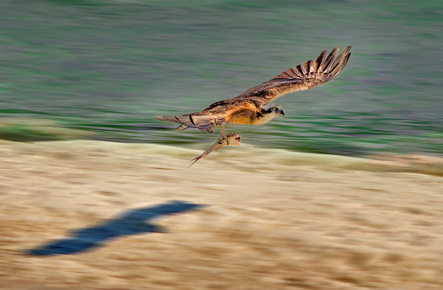 I tried to separate the bird and fish from the background. I did a blur on the background to give a sense of the birds motion. I used a number of tools including Hue & Saturation to change to water color a bit, Topaz Clarity to bring out detail on the bird's body and more color & contrast & PS Highs & Shadows. |