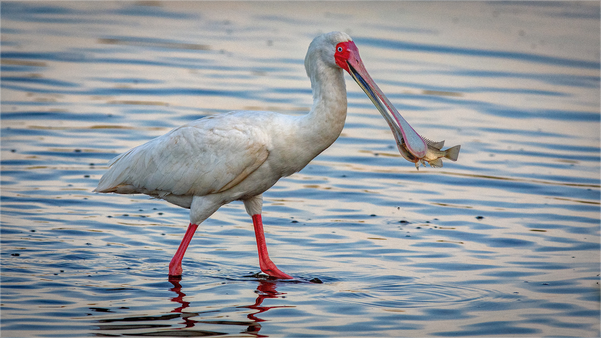 Wonderful image. The bird seems to smile at the viewer, pleased with his catch. I am sure that your editing had much to do with the quality of his image. Having shot spoonbills in the wild I think I would have added a little saturation to the birds legs and bill. I attached my version with a little more color. But maybe this species isn't as colorful. Nice work. |