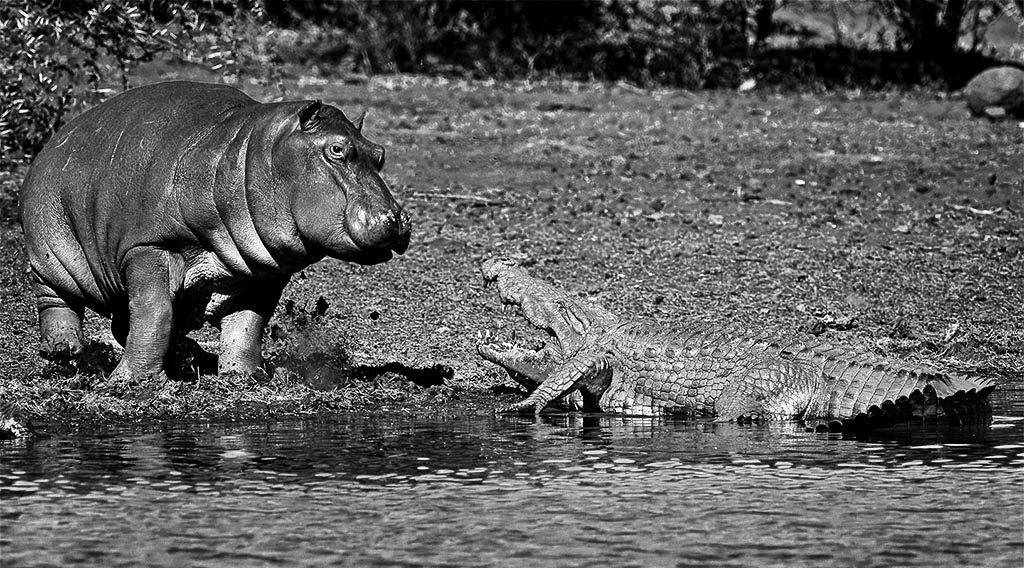 The shades of yellow, green and brown that predominate in this image are so very similar that I wanted to see how it would do as a B/W. Here it is in Silver Efex Pro with cropping, a green filter, extra contrast and vignettes added to emphasize the croc and darken the water.