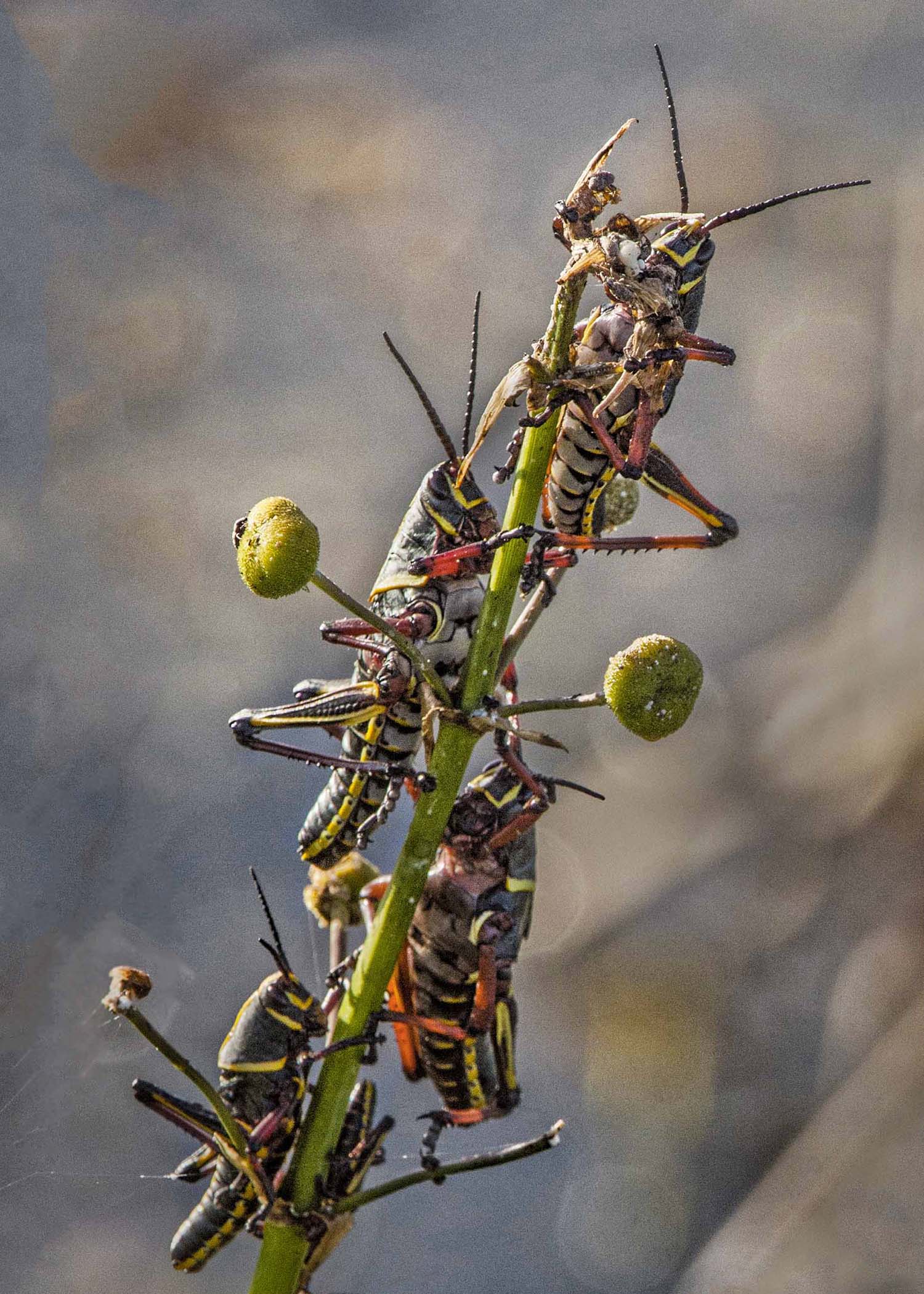 Seven grasshoppers is a lot of grasshoppers! But when I zoomed in on the image, I realized how wonderful a job tou did in maintaining focus, while giving us that extra-creamy bokeh. I think concentrating on the top four grasshoppers still tells the story of how crowded this twig is, while better showcasing that sharp detail! |