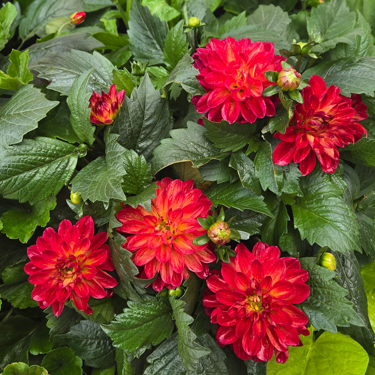 I personally find capturing good images of flowers with dense foliage challenging. Seldom can I find an optimal frame or crop (which is probably my inexperience). In this case, I suggest considering a square crop that omits the lower-left flower and touch of red on the left border. The photo also feels a little dark. Experiments with increasing the exposure blew out the flower highlights, so I used a color range mask isolate the greens and increase just their exposure.