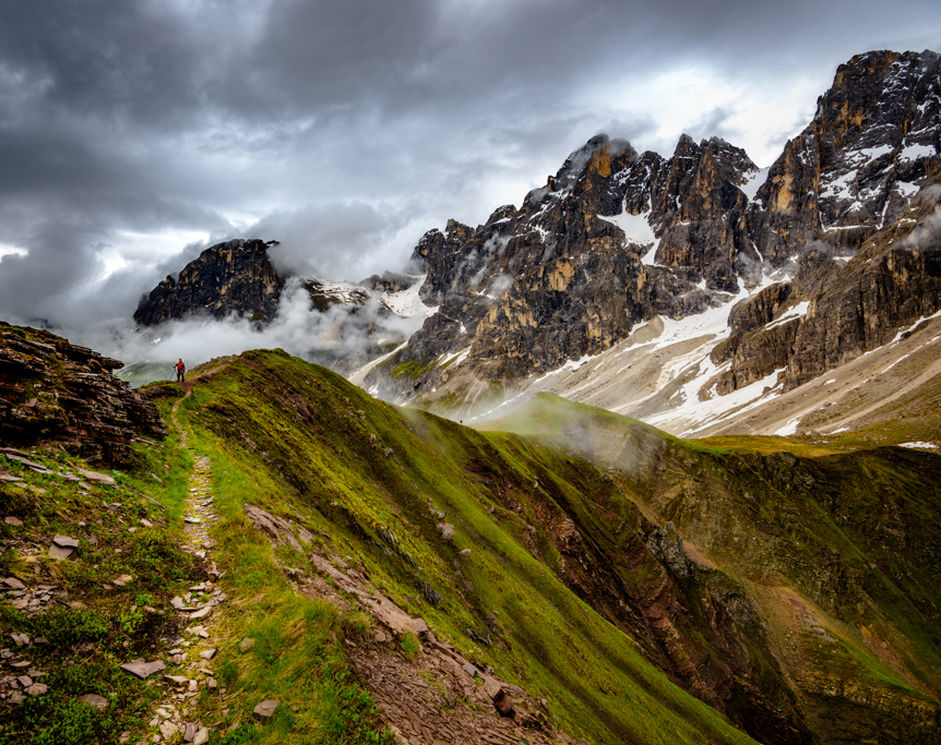 Well you have done what you were after, a dramatic scene of weather and mountains and that person on the end on the path is so important to hold the image. I do think you are just getting to the edge of over processing the image, but the dramatic scene is just holding it.