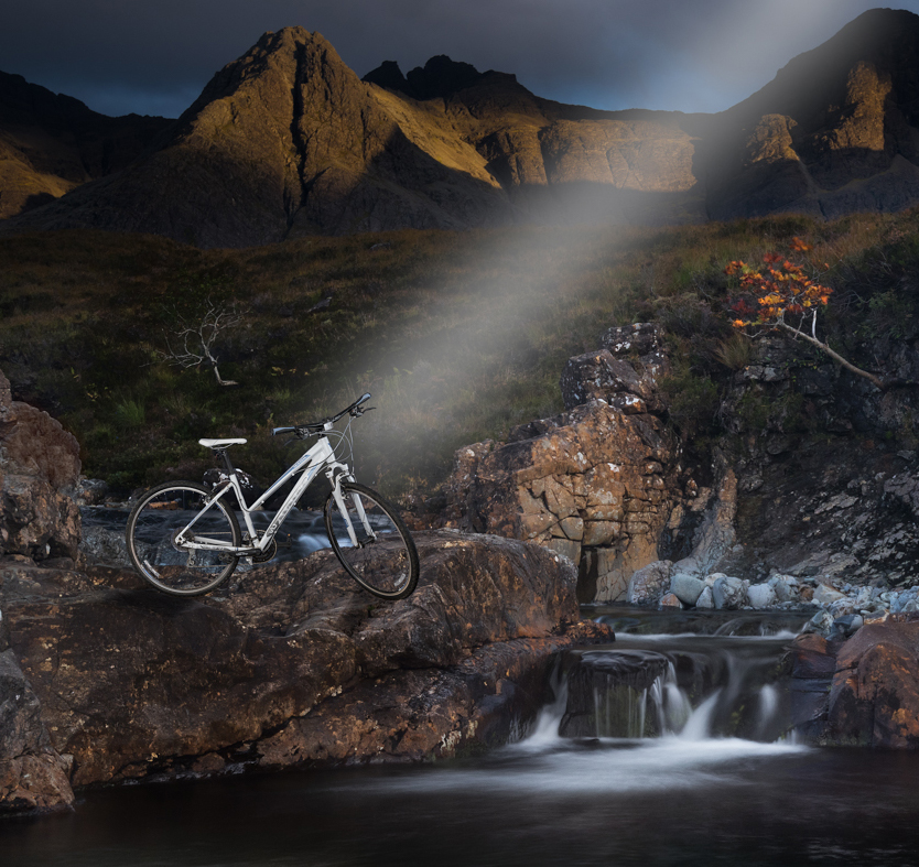 Ok I have looked at this a couple of times and think that I need to comment on this more as a commercial picture than a landscape image. The idea of this image is very good and the placement of the bike on the rock is ok. But I think that you have done two things wrong for me that I would have to have corrected before publishing. 1) I think you put to much into the image and did not focus on the bike as tight as you could using the landscape around. See crop for a tighter crop. 2) You have made the ray the dominate part of the image and it for me overpowers the bike and its surrounds, the ray should be there to suggest the viewer to the bike not thump them there.