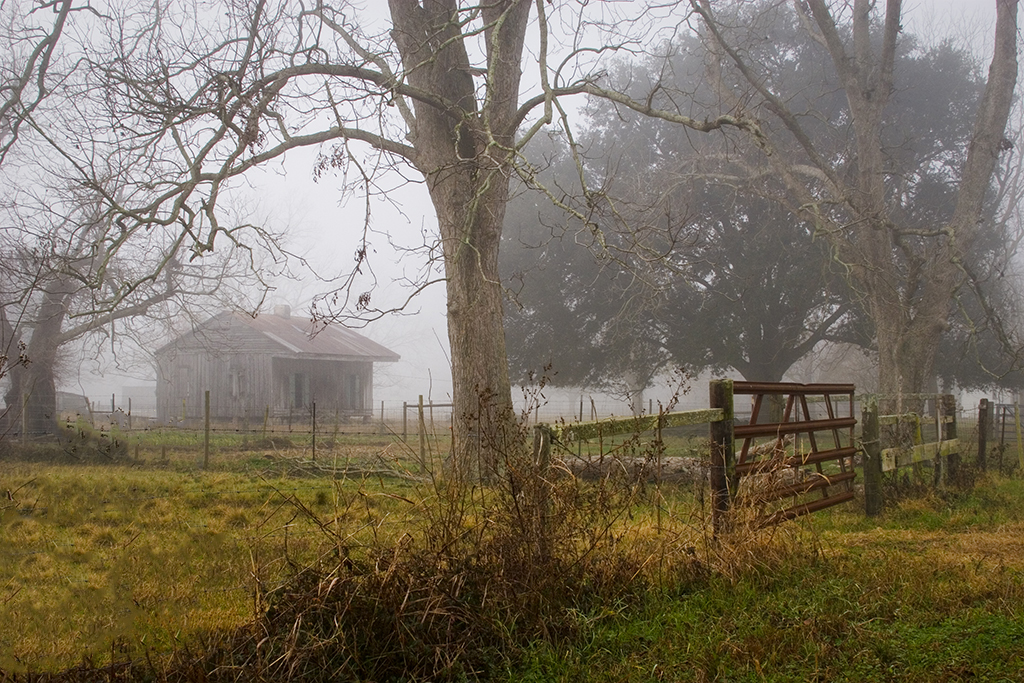 OK here is the argument. I don't think the tree is the problem. The tree and the tree of the far left make for a nice gap for the viewer to peer into to the cabin, but you have these weeds and that big post blocking your way, if you remove them the image changes brilliantly. Just aloows the viewer to flow the hut. Nice fog by the way. |