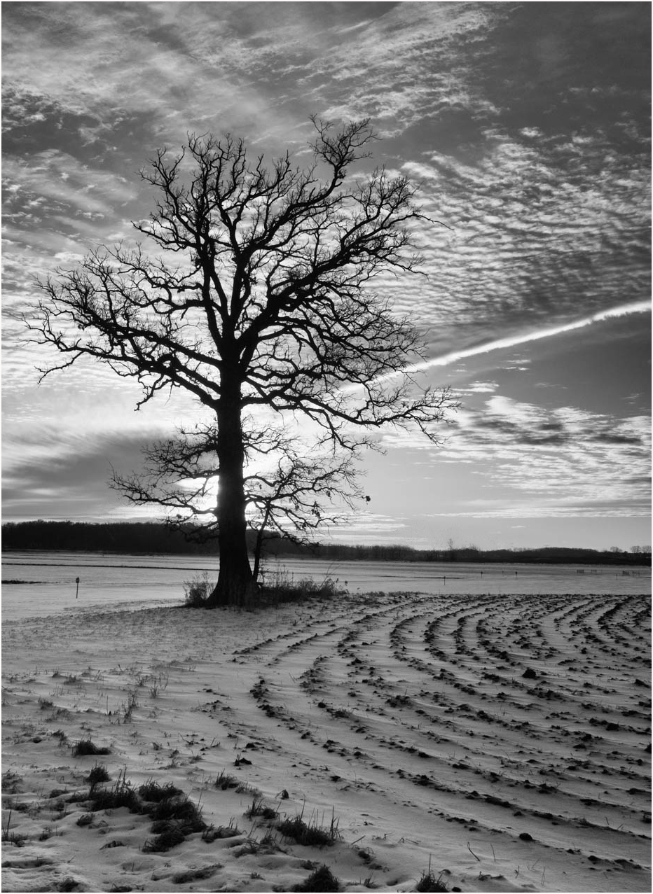 I am always on the lookout for tree's in the middle of fields as they can make for great images. This is a good example which has nice stark strength, great sky with the last light balance. But I do think that the lie of the land and placing the tree dead centre does not as presented, so I have flipped the image and allowed the plough lines to lead you to the tree and placed the tree more on the thirds, I have also removed those man made distractions that sit in the background. I personally find this a better balance. |