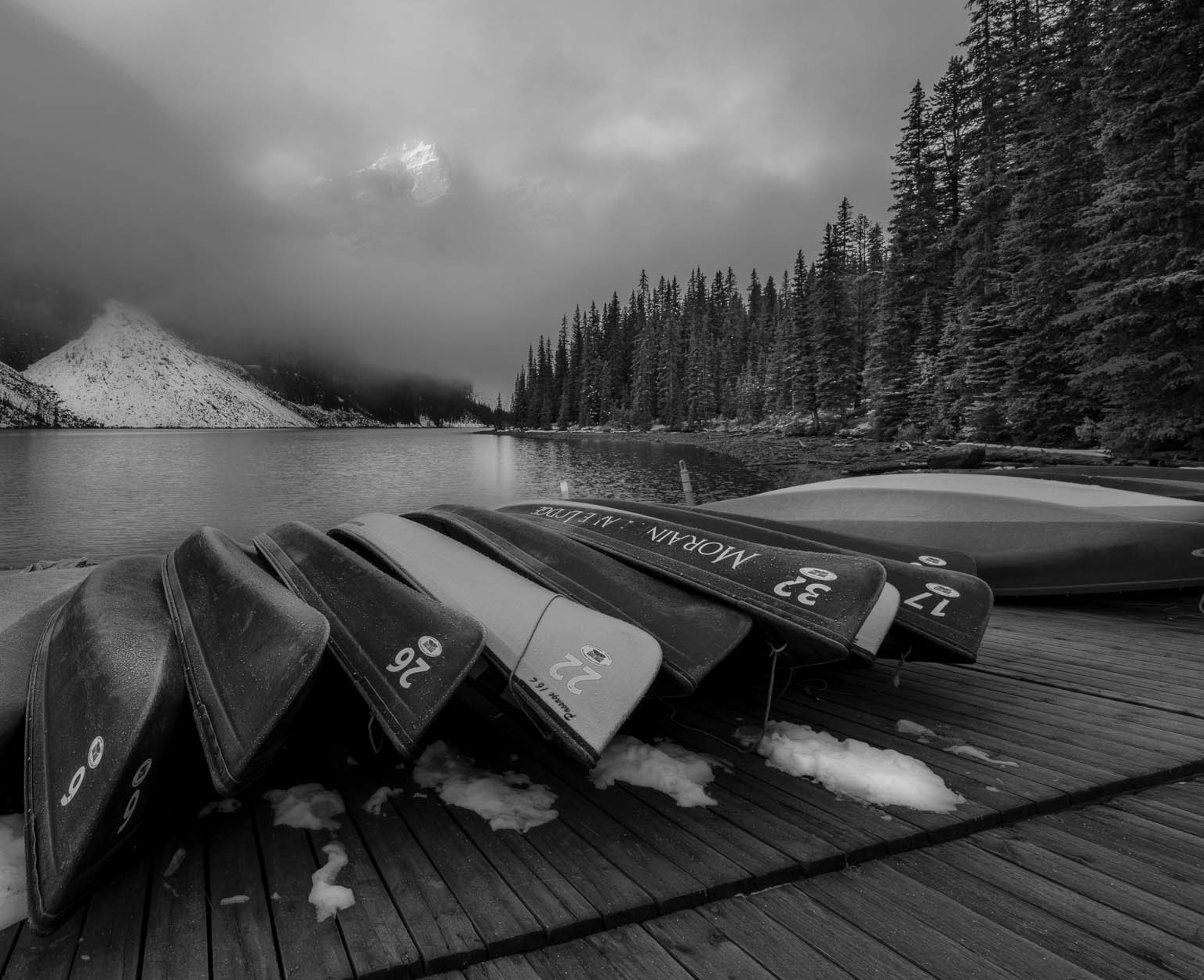 The shape and lines you have composed here leads you the viewer to the beauty of that mountain top just appearing through the clouds which is very lovely. In the monochrome version I fine the left hand side loses its strength, where with the colour it is held by the blue.
