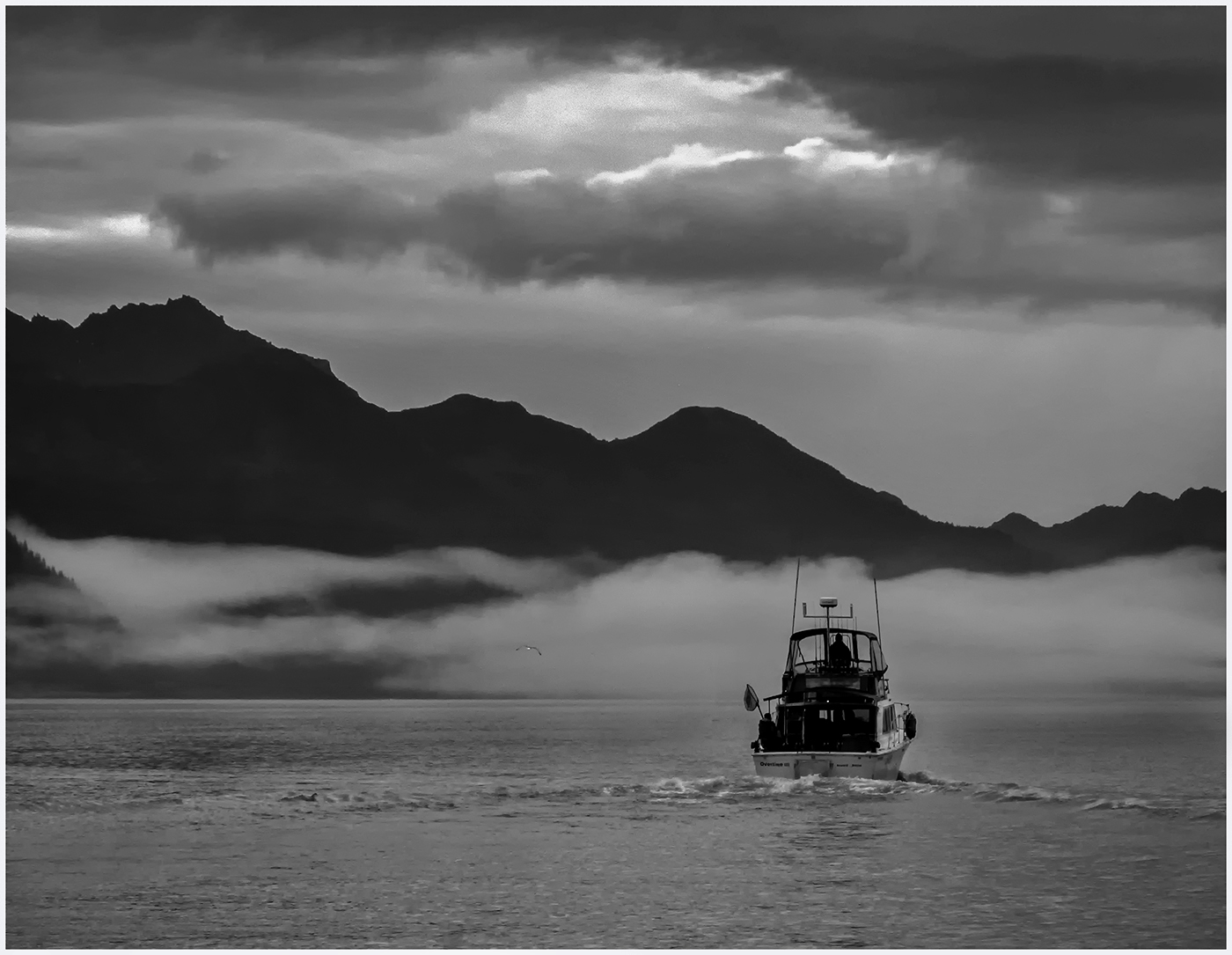 What a great image, you can hear that voice on the radio "Don't go into the Fog". The boat is nicely placed in the frame and the combination of the dark mountains, and the moody clouds and that fog bank makes for a classic image.