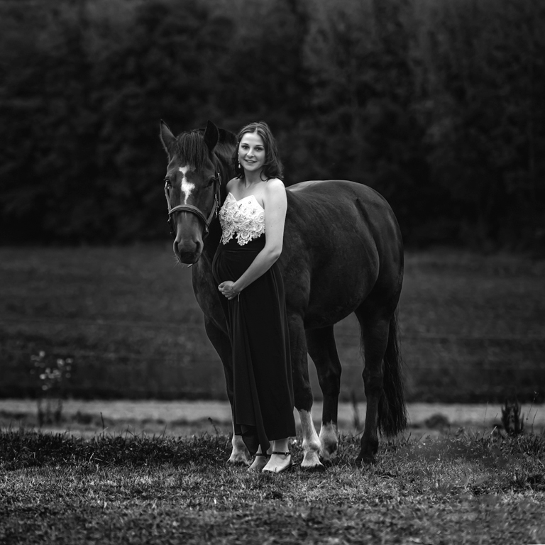 This is a pretty image of the lass with her horse, the horse is nicely posed over her shoulder and is looking at the camera and the lass has a pretty smile.