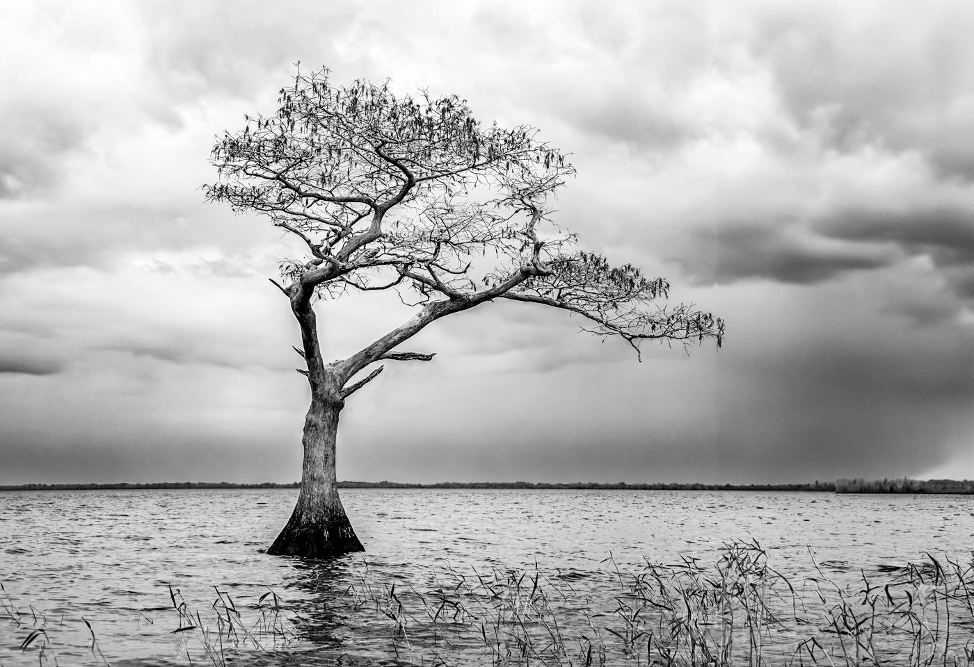 The tree sits well in the frame and you have a lovely cloud base as a background. The grasses popping above the water gives you a nice base to work with. But the lighting on this dull day is not helping you for a good colour image, but it is helping for a strong monochrome one in my opinion. |