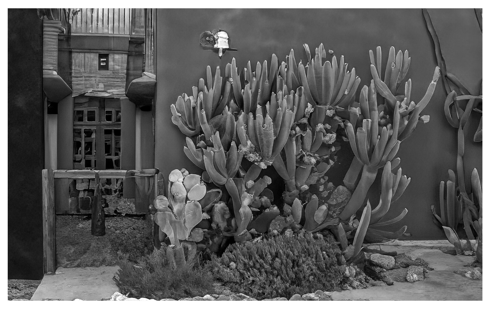 As for the image, but the eye is being drawn by that dead sky which is a shame as there some nice detail in the catus and wall. Just an idea for an alternative. |