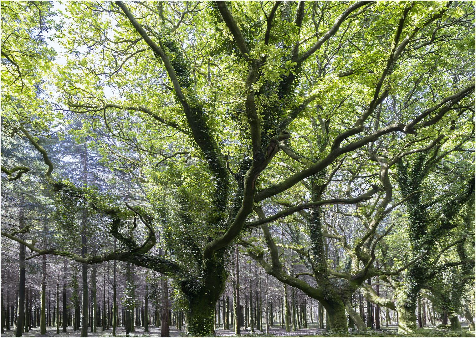 They are a set of wonderful trees and sitting next to the man made plantation it does show off the magnificence of them. You are struggling with converging verticals which could be corrected in photoshop, see my version. But very pleasing image to view. |