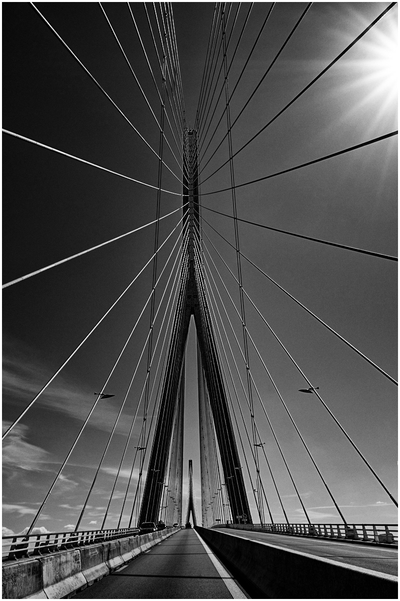 You have done well considering this is from a moving car on the bridge. The angles are spot on and the lines are straight leading you into the image. The tones are ok but a bit flat and safe. You also removed the sunburst instead of using it. So I have done a version with the sunburst left in and put through Silver Efex 7 on a high Contrast setting. See what you think. |