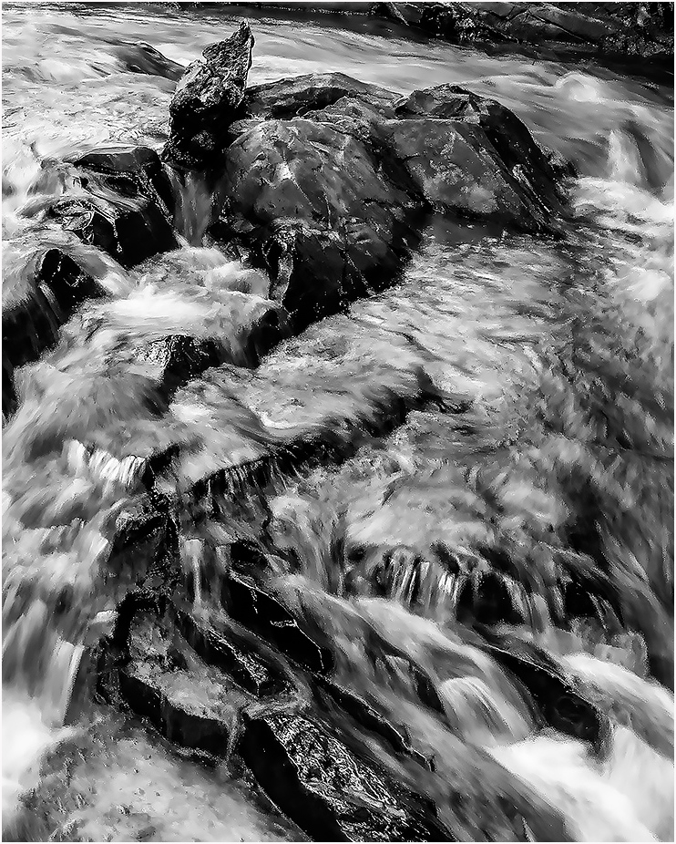 The image you have presented I think we all would have headed straight for and taken in one form or another. I may have shot this as three images and combined them so I could get the best from all parts. But as the way you have shot this image the main central water is sort of dominating the images and my eyes struggles to go the those lovely rocks and textures. Three images would have given you better balance and control in processing. There is another image in here that I quite like. See attached. Your black and white ratio is very good. |