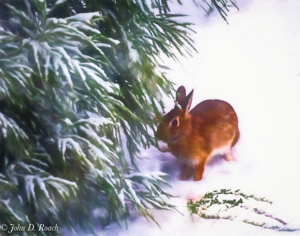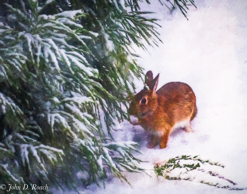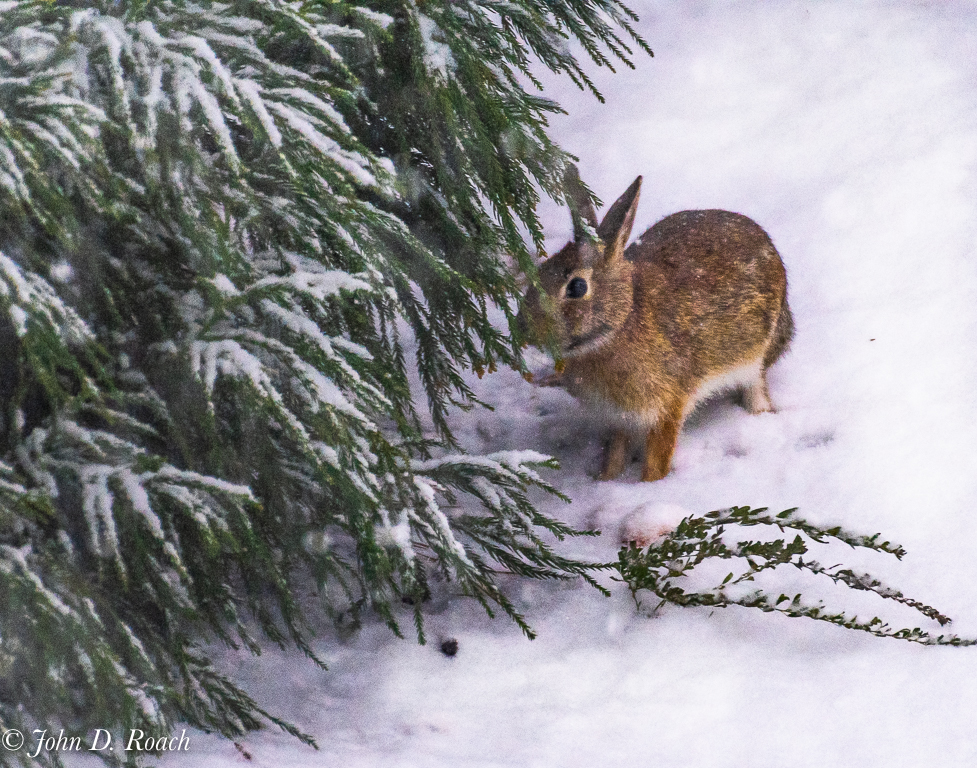 Putting the lens against glass on the cold snowy day would have fogged the glass on the lens and, unfortunately or fortunately, I was actually photographing the birds at the bird feeder so I needed to be able to move the lens around. It was just a lucky chance to see the bunny for that short moment in time and get a few snaps of it.