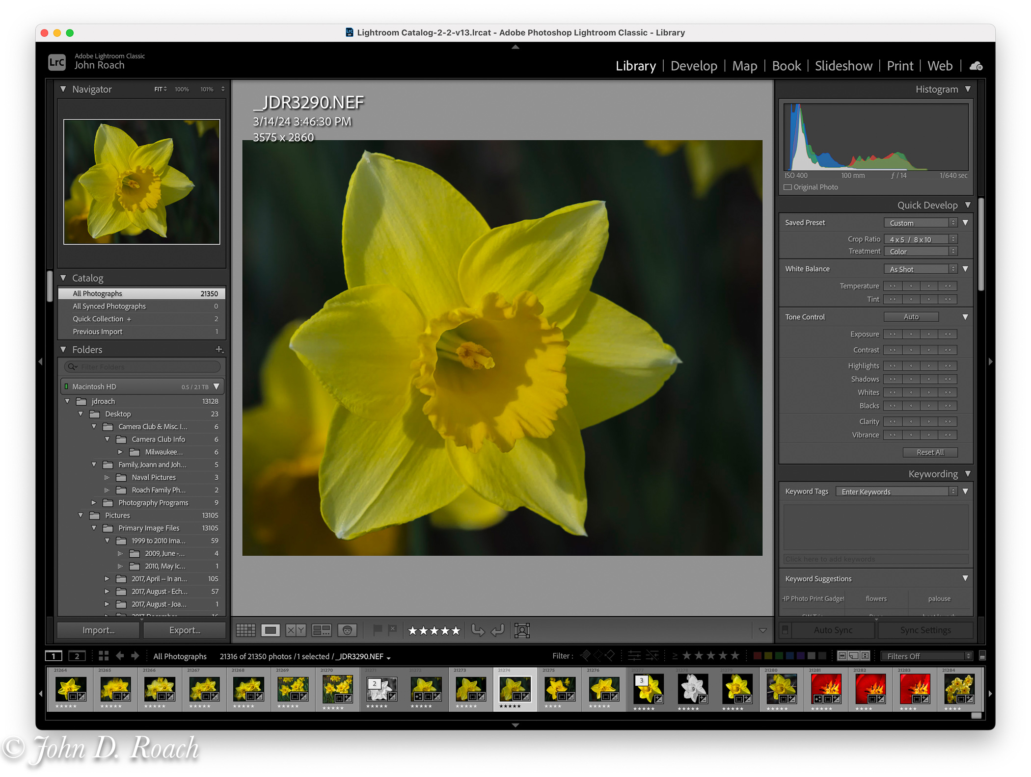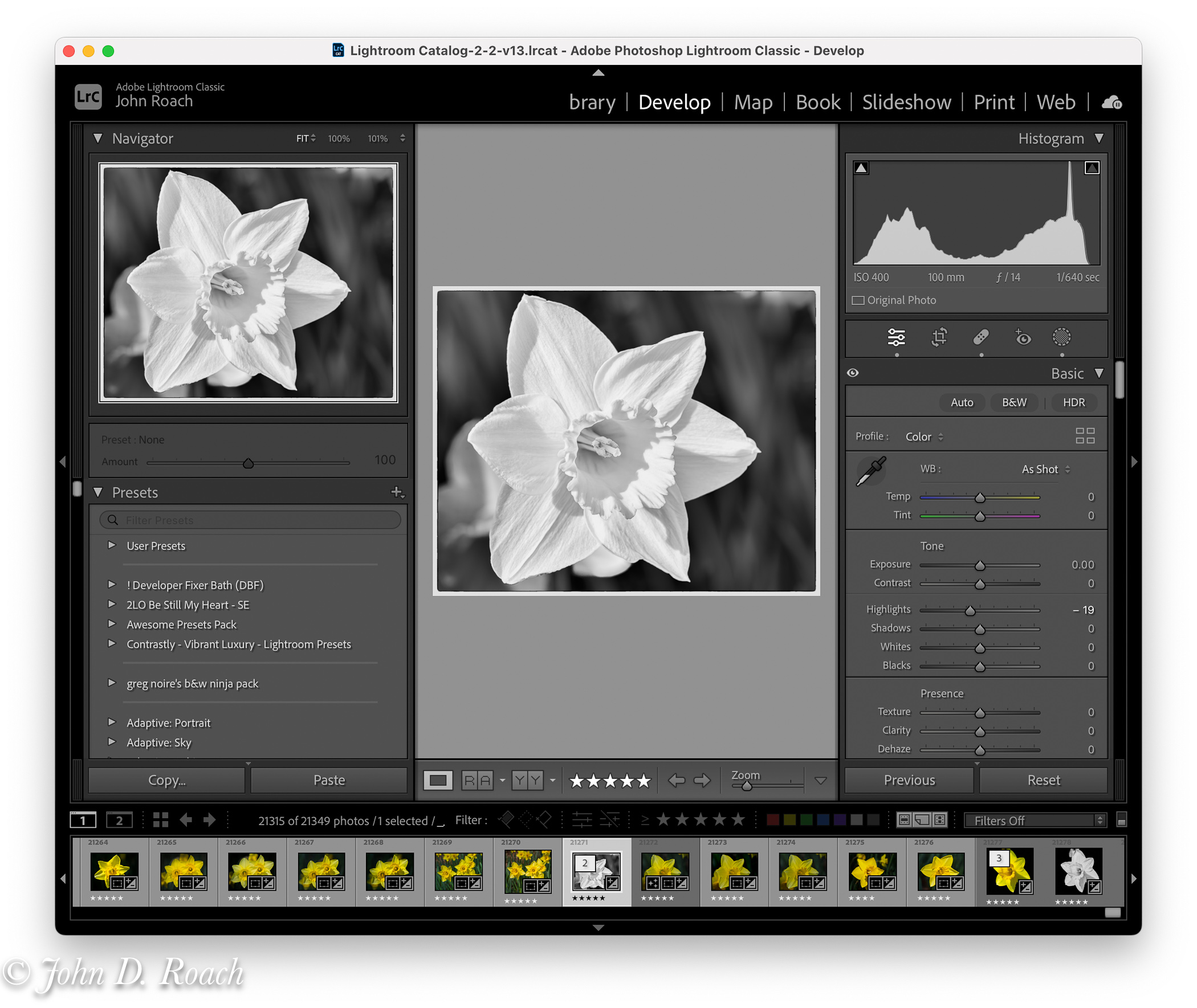 They aren't blown out per the histogram in monochrome, but I did use a High Key option among the DxO Nik Silver Efex options which brighten it up a lot but still didn't blow out the blossom. In the Original Color it was not tight to the right either in the Histogram. See the histograms attached 1st the mono version and 2nd the Original Color version. |