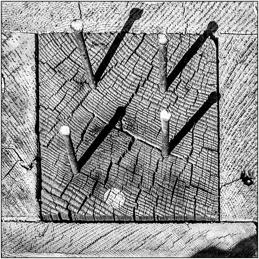 I like the way the nails and their shadows make check marks in the image. You might trying to enhance the abstraction by making this a square with just the top of the post and no background. You couldn't do this in camera since you would lose the check marks but this could be skewed and cropped to pull it off. |