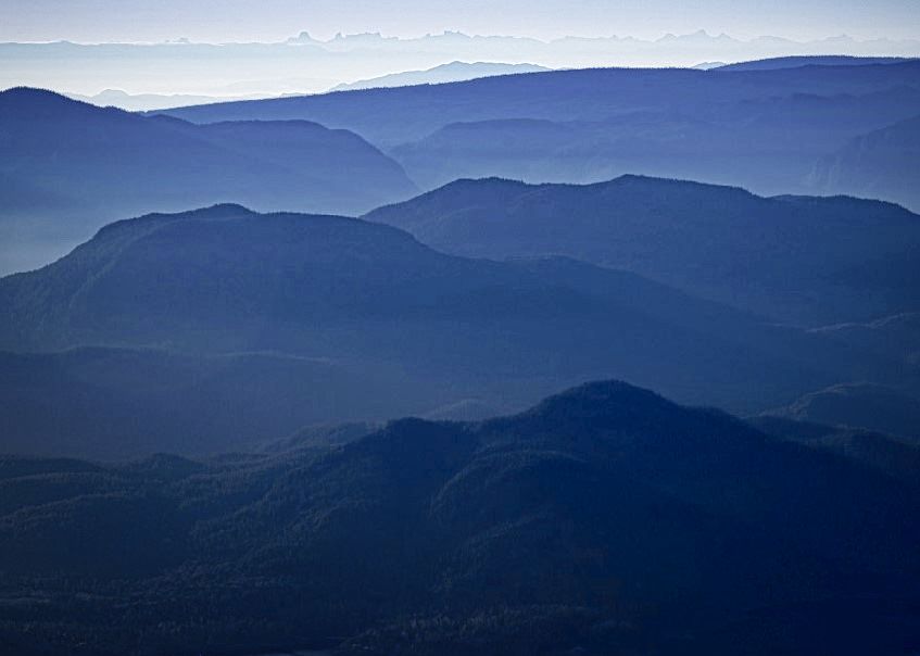 I really like the layers and the haze that separates them. You have really improved the original. I think that I would get rid of the light reflection in the water by cropping. Adding a vignette on mainly the bottom would give you the dark peak for a subject to rest the eye. (I do like this one to see what I can do without Adobe products.) |