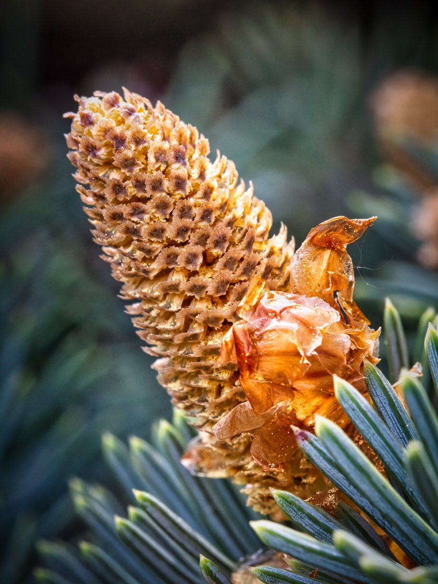 Here is a picture of the tree genitalia with pollen. That is the little yellowish dots. If you tap these a little yellow cloud comes off. It shows how very small the ant was. I couldn't see if there were any ants unless I got down closer to them. |